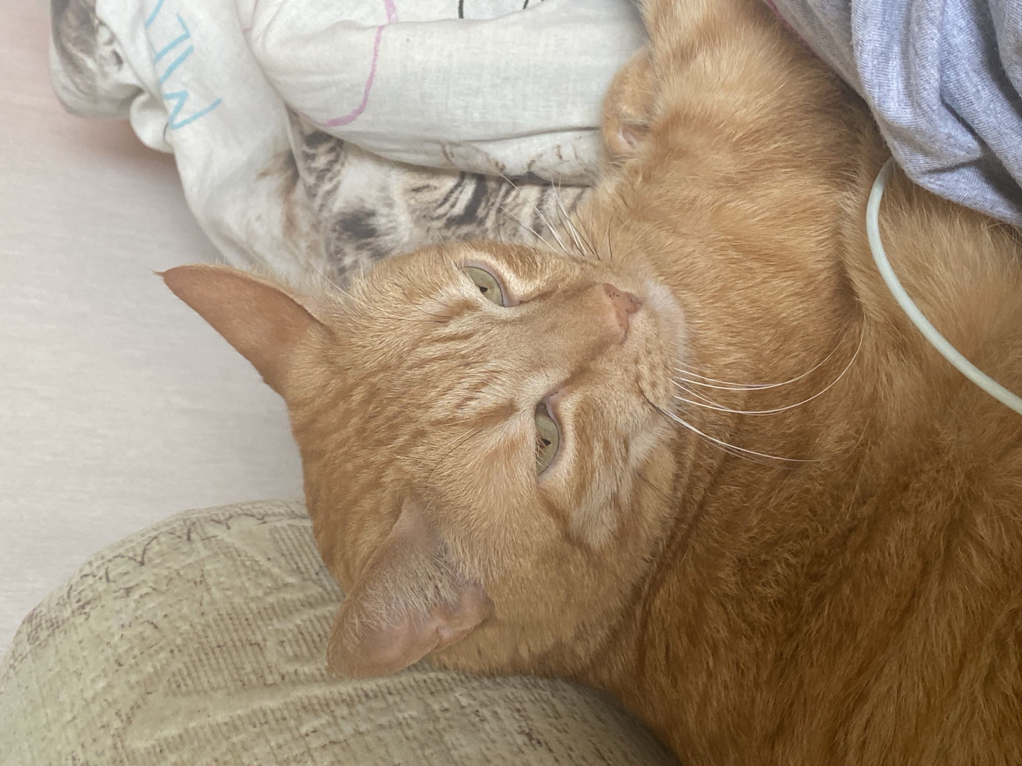 - "An orange tabby cat is depicted lying down indoors, facing right, with its head and upper body in focus" by FM-uK62y1, licensed under CC BY 4.0