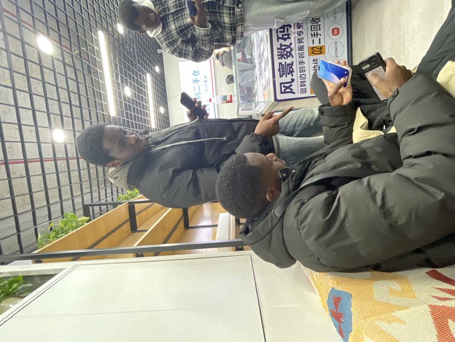 Inside a mobile phone store in Shuangfu, China, three Black males are observed