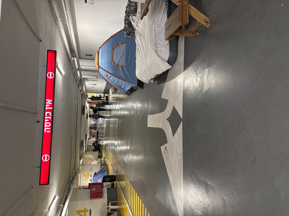 This image depicts a section of an underground parking garage, specifically level -4, in Tel-Aviv, Israel, identifiable by the Hebrew "אין כניסה" (No Entry) sign overhead. The concrete floor is dark gray with white directional markings and yellow and black striped safety zones. Overhead, a red illuminated sign displays "אין כניסה" with 'no entry' symbols on either side, hanging from a concrete ceiling with exposed pipes and fluorescent lighting. Along both walls of the corridor, various temporary shelters are set up. In the foreground on the right, a blue and orange camping tent is erected next to an inflatable mattress covered with white bedding and pillows, adjacent to a small wooden picnic-style bench. Further down this side, additional bedding and personal items are visible. Along the left wall, a blue camping tent is visible near a red wall-mounted cabinet, likely a fire extinguisher box. Another white plastic chair is situated near the striped floor marking. Further into the background, multiple camping tents in various colors (blue, white, grey) line both sides of the corridor, interspersed with personal belongings. A motorcycle or scooter is parked on the left side, deeper within the facility. Approximately seven to ten individuals are visible in the mid-ground. One person on the far left appears to be holding a tripod or camera. A group of two to three individuals is walking towards the foreground, while others are standing or moving further back. The overall scene suggests a large underground space repurposed as a temporary living or shelter area.
