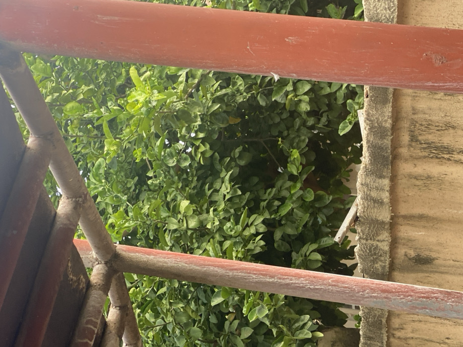 An outdoor scene in Zango-ndaji, Nigeria, is presented from a low-angle perspective. In the immediate foreground, a framework of reddish-brown, corroded metal pipes occupies the upper-left and left side of the image, featuring welded joints and significant surface wear. A smooth, reddish-orange cylindrical pole stands vertically on the right side of the frame, showing minor scuffs. Behind these structures, a weathered, light-tan concrete wall with a textured, darker grey coping runs horizontally across the midground. A thin, light-colored piece of debris rests on the wall's coping. The background is dominated by dense, vibrant green foliage of a tree or large bush, with numerous leaves and several small, round, green fruits visible within the canopy. No individuals, actions, or interactions are visible.