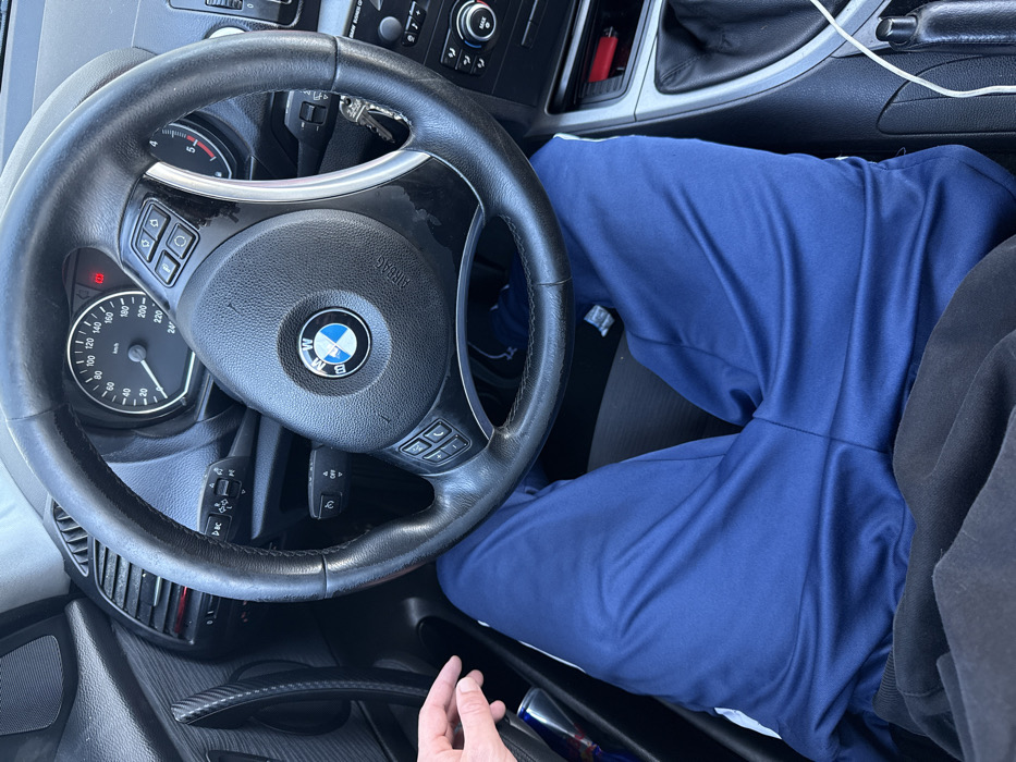 The image displays the interior of a BMW vehicle, viewed from the driver's seated perspective in Chantepie, France. The driver's lower torso and legs, clad in blue track pants and a black garment, are prominently featured. A black leather-wrapped steering wheel, with a central BMW logo, "Airbag" text, and integrated control buttons on a silver-accented frame, occupies the middle ground. Behind the steering wheel, the instrument cluster shows a speedometer marked to 240 km/h and a tachometer, with one red warning light illuminated. Keys are visible in the ignition area. To the left, a light-skinned hand reaches into the driver's side door pocket, which contains a silver and blue cylindrical can. The center console reveals a manual gear shift with a black boot, climate control dials, a red object within a storage slot, and a white cable.