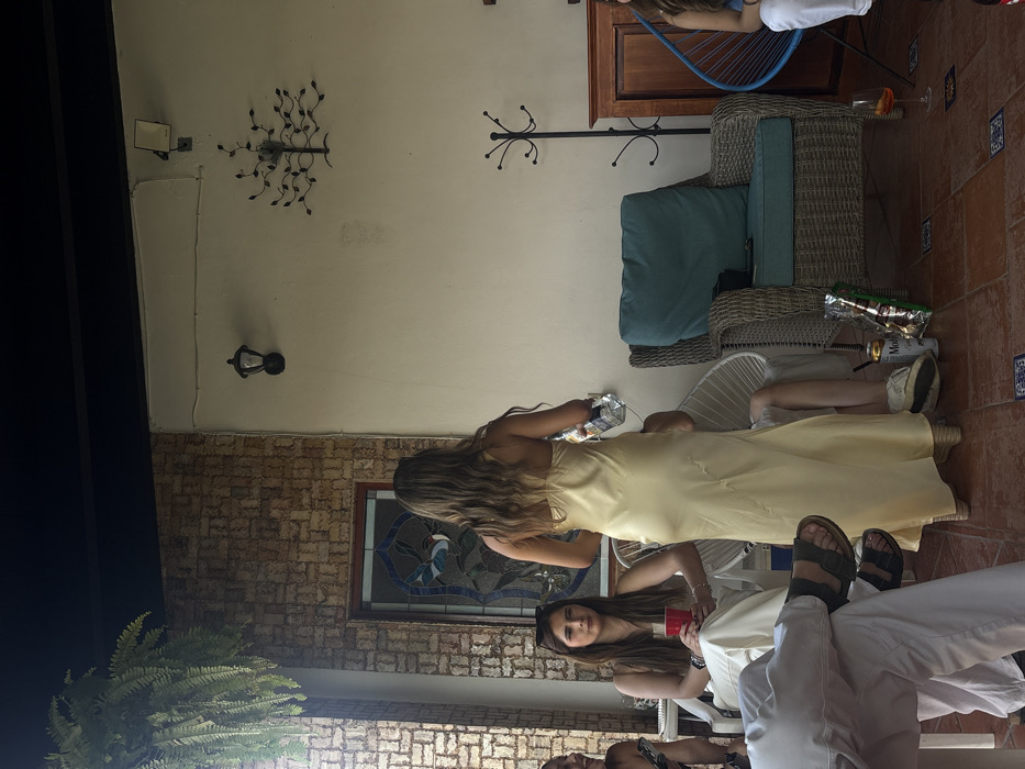 The scene depicts a social gathering on a patio or terrace in Tenextepec, Mexico, during daylight hours. In the center, a female subject stands with her back to the camera, wearing a long, light yellow, possibly satin, slip dress. Her long, wavy brown hair falls down her back. She is holding a clear glass bottle in her right hand, suggesting an action of pouring or serving a beverage. To the left of the central figure, a female subject is seated in a white plastic chair, facing forward. She has long, dark hair, with dark sunglasses resting on top of her head. She is wearing a white sleeveless top and white wide-leg pants, and holds a red cup in her right hand. Part of another person's arm and torso are visible further to her left, also seated. In the immediate foreground on the left, the lower half of a male subject is visible, wearing white pants and dark sandals, with his legs crossed. To the right of the central figure, a wicker armchair with a teal cushion is visible. A black bag or purse is placed on the cushion. On the tiled floor in front of this chair, a silver beer can (Modelo Especial) and a bag of potato chips are present. Further to the right, a blue woven 'Acapulco' style chair is partially visible, with a stemmed glass containing an orange liquid on the floor beside it. A dark-colored coat stand with multiple hooks stands between the wicker chair and a dark wooden cabinet on the far right. The environment includes a terracotta-tiled floor with scattered blue decorative tiles. The left wall features a textured, light brown brick-like pattern, with a rectangular stained-glass window depicting a bird in flight. Above this window, a large green fern plant hangs from the ceiling. The right wall is painted a light cream or off-white color, featuring a black wall-mounted lantern and a decorative black metal art piece resembling a tree with leaves. A black ceiling beam runs across the top of the frame.