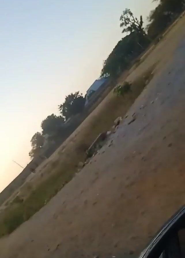 view from a moving car on a dirt road in a rural area at what appears to be dawn or dusk