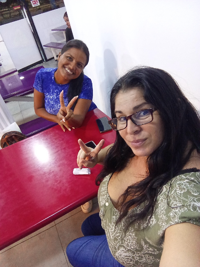 - "An indoor selfie depicts two adult females seated at a red rectangular table within a casual dining establishment in Juan Griego, Venezuela" by FM-LkkdS2, licensed under CC BY 4.0