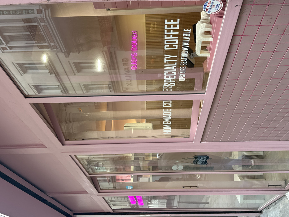 The image displays the exterior of a commercial establishment identified as OJO'S DOUGH, located at 64 Rue Jean-Jacques Rousseau in Paris, France. The building's facade is predominantly a pale pink, featuring large glass windows and an entrance door. The lower section of the exterior is clad in small, rectangular pink tiles, while the upper portion, including window frames and panels, is smoothly painted. White adhesive text on the main window states "HOMEMADE COFFEE & SPECIALTY COFFEE" and "UPSTAIRS SEATING AVAILABLE." A pink neon sign inside the establishment displays "OJO'S DOUGH." Through the glass, a wooden slatted wall and warm interior lighting are visible, along with white seating elements and a stack of white, possibly plastic, small stools or risers near the window. The entrance door has a "PUSH" sticker and an "OPEN" sign hanging from its handle. A circular "VITRIER" sticker with French text, phone numbers, and "DÉPANNAGE D'URGENCE" is affixed to the lower right window. The glass windows prominently reflect the urban environment across the street. These reflections show classic Parisian buildings constructed of light-colored stone, featuring multiple stories, windows, and decorative wrought-iron balconies. A reversed reflection of a sign reading "GRAVILUX" is clearly visible. Faint reflections of individuals are present; one person appears near the establishment's entrance, and another is visible on the reflected street. A grey sidewalk is present in the lower left foreground.