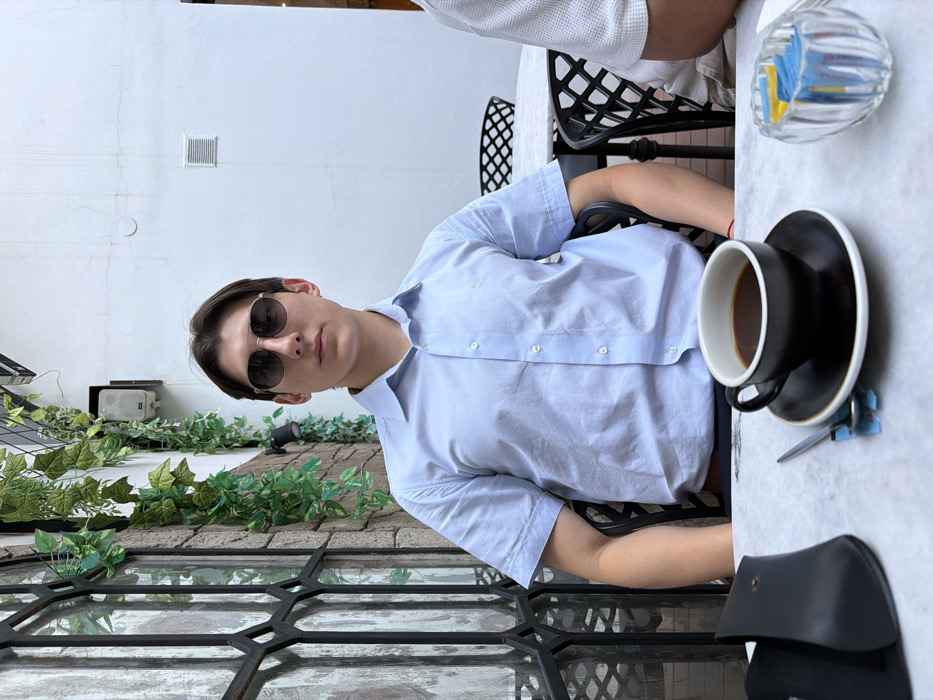 A young man in sunglasses and a light blue collared shirt sits at a table with a black cup of coffee. A sugar packet dispenser is also on the table. The setting appears to be an outdoor cafe or patio with greenery visible through a window-like structure behind him. The man faces the camera with a neutral expression. The picture is rotated counter-clockwise.