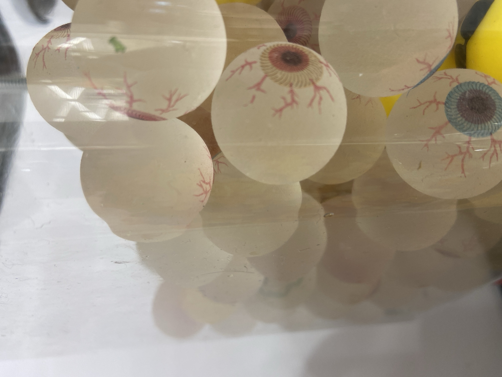 Numerous novelty spheres, designed to resemble human eyeballs, are contained within a transparent vessel