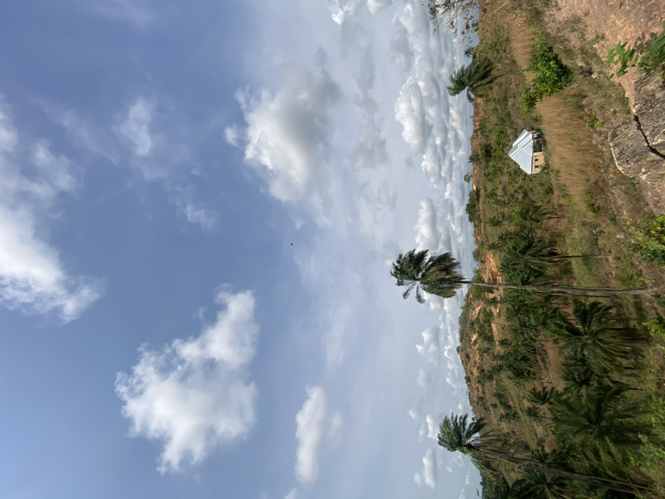 A panoramic photograph depicts a rural, hilly landscape in Achara, Nigeria