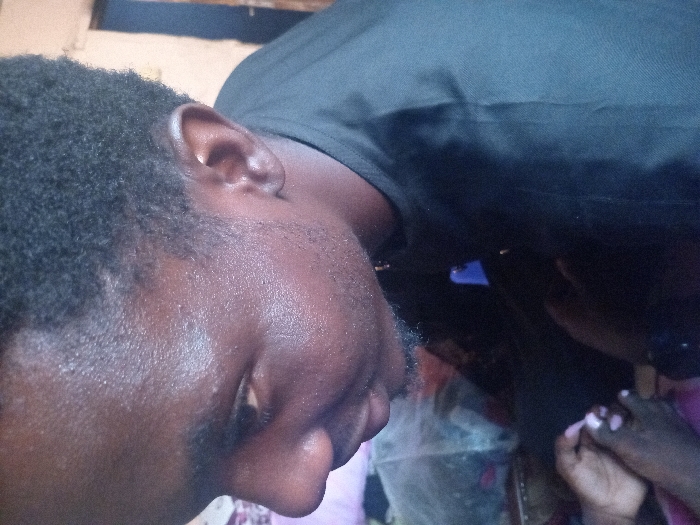 The scene takes place indoors in Jos, Nigeria. The primary subject is an adult individual with dark skin and short, curly black hair, positioned in a partial right-profile view, looking downwards and to the left of the frame. The individual wears a dark, possibly black, collared garment, to which a small, bright blue, triangular object is clipped near the chest. A faint, dark beard or stubble is visible on the chin and jawline. The individual's right hand is visible in the lower left, with light-colored fingernail polish, holding or interacting with a smaller hand, which also displays light-colored fingernail polish. A dark watch or wristband is present on the individual's right wrist. The background features a light brown wall, partially obscured by a transparent, possibly netted, fabric. A dark doorframe and a slightly ajar dark door are visible on the right side of the background.