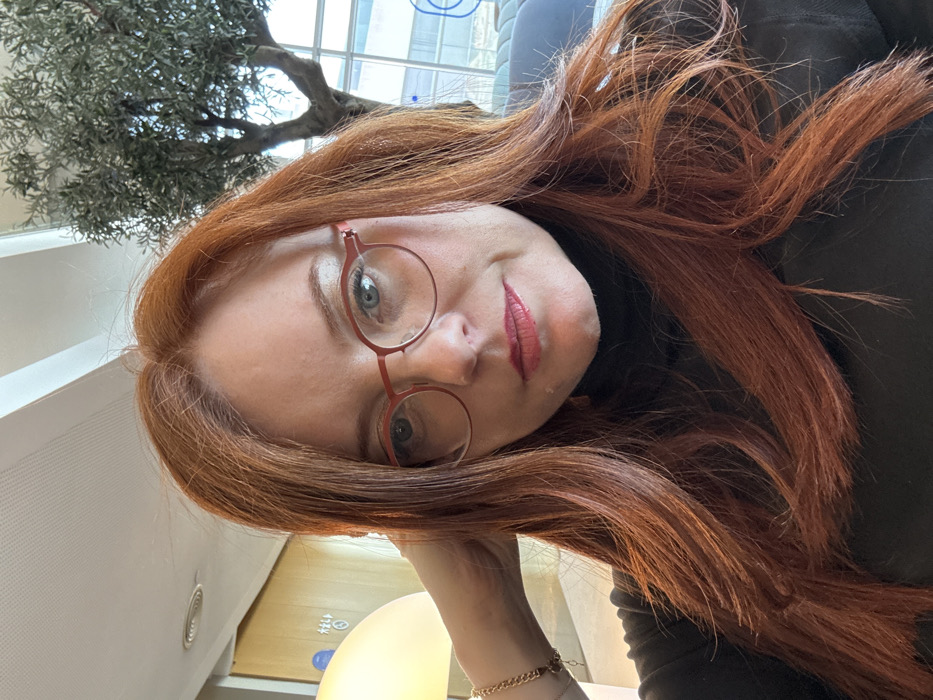 - "The image features a woman with long, reddish-brown hair and blue eyes, wearing round red-framed glasses and a black turtleneck, looking directly at the camera" by FM-kvEG43, licensed under CC BY 4.0