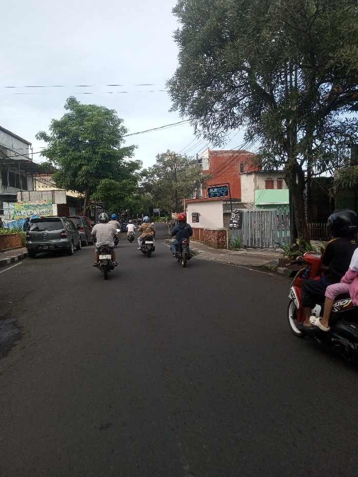 The scene depicts an urban street in Phonsavan, Laos, under an overcast sky. A paved asphalt road, appearing damp in sections, extends into the distance. Traffic, consisting primarily of motorcycles and scooters, travels away from the viewer. In the immediate foreground, to the right, a red and black scooter is operated by an adult, who is partially visible. A child, wearing a pink top and white shoes, is seated as a front passenger. Further down the road, five additional individuals are operating motorcycles; all visible riders are wearing helmets. The lead rider in the mid-ground wears a light-colored t-shirt and light shorts, with a light helmet. On the left side of the road, a series of parked vehicles, including a dark grey hatchback, are situated behind a concrete curb and an area of green vegetation. Buildings with corrugated metal siding and partial signage are visible on the left. On the right side of the road, a sidewalk is present, bordered by a low, multi-toned stone wall and a metal gate. Behind this, a multi-story building features a red upper facade and a white lower section, adorned with a prominent dark blue sign. An adjacent building to its left is painted light green. Numerous trees with dense green canopies are distributed throughout the scene, particularly a large tree on the far right. Overhead utility lines are visible against the light grey sky.