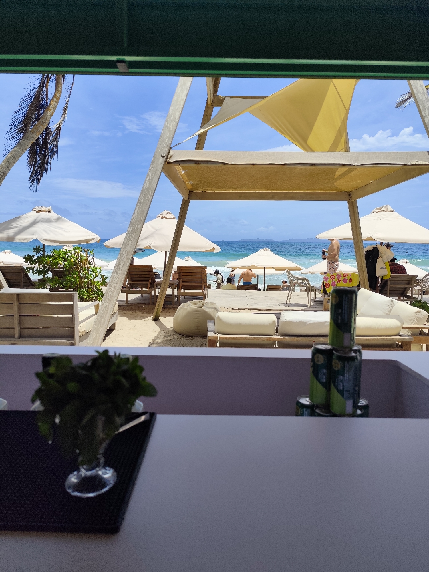 beachfront scene in Playa Parguito, Venezuela, viewed from behind a bar