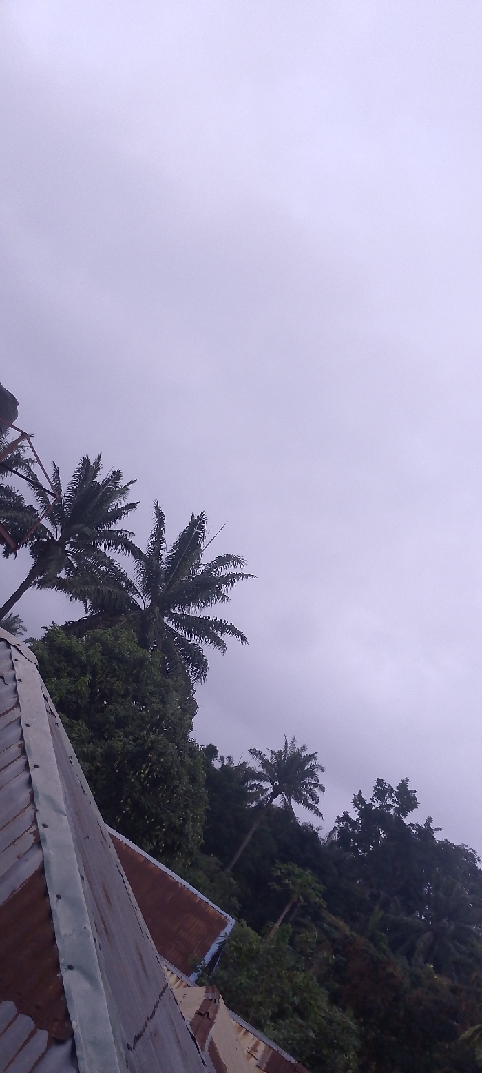 A cloudy sky dominates the scene above a verdant landscape. Several palm trees of varying sizes stand amongst lush greenery, creating a tropical ambiance. In the foreground, a weathered corrugated metal roof adds a contrasting texture. The overall muted color palette reinforces a sense of overcast weather and natural surroundings.