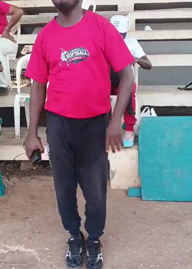 A man is dancing outside a stadium. He is wearing a red t-shirt, black sweatpants with the word "BOSS" on the side, and black sneakers. He also has on a two-tone baseball cap, white in the front and blue on the brim. The t-shirt features a logo with a softball player. The man appears to be enjoying himself as he moves to the music. He is standing on a concrete platform. Behind him are white plastic chairs and the stadium bleachers. Other people are sitting in the bleachers.