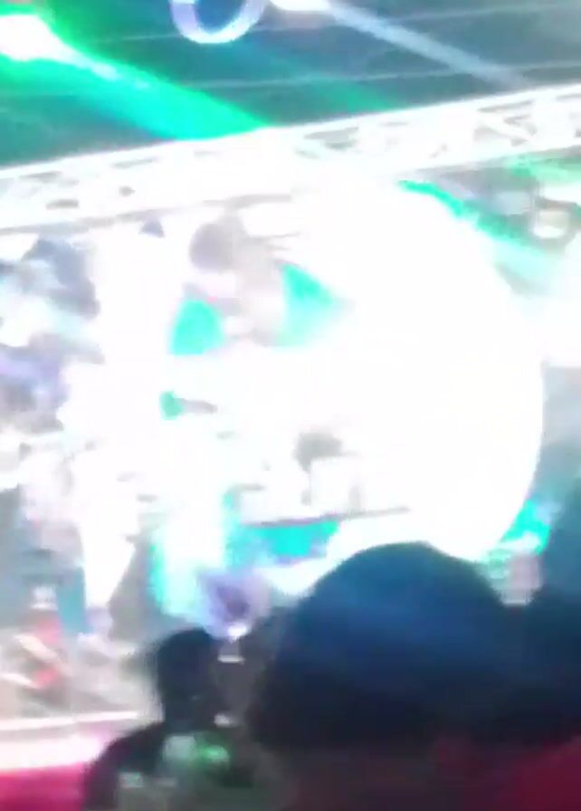 A low-angle shot shows a dance performance on stage. Three shirtless men are on stage, dancing to traditional music. They are wearing colorful beaded and patterned fabric wraps around their waist. A large screen behind them displays the text "GARGA YA". The stage is brightly lit with moving lights, and a metal truss structure is visible above. The audience is visible in the foreground, with heads and shoulders of people who are seated watching the performance.