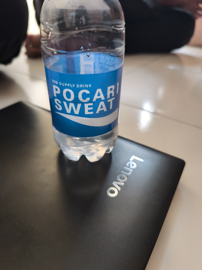 - "A clear plastic bottle of Pocari Sweat, approximately half-full of clear liquid, stands upright on a closed black Lenovo laptop" by FM-Zdynl1, licensed under CC BY 4.0