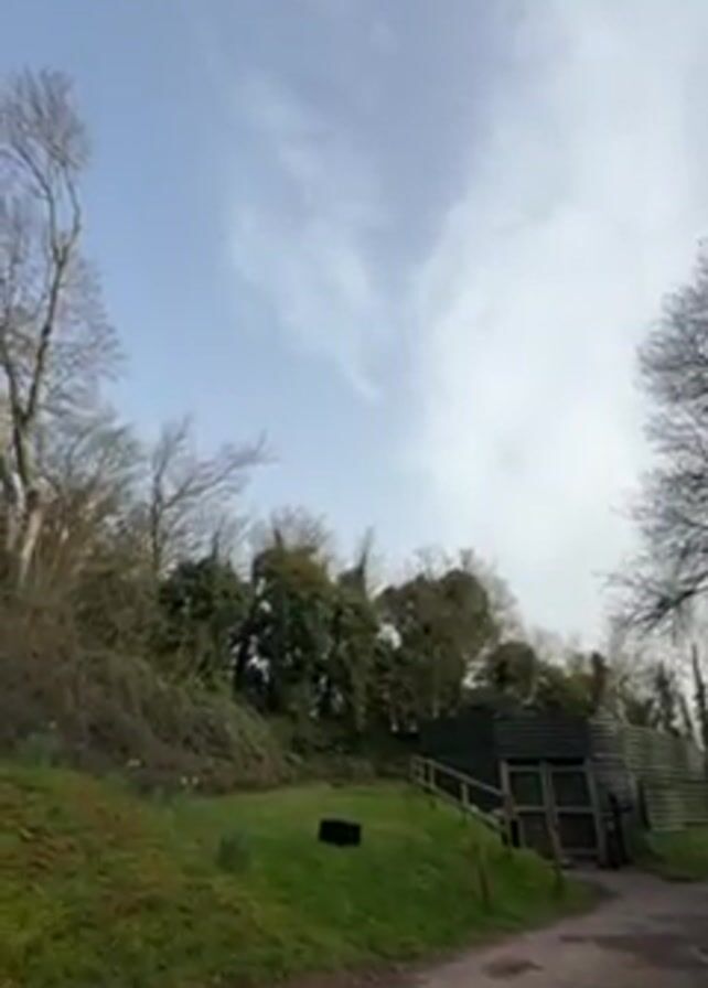 smoke grenade exploding. The grenade is placed on a grassy hill next to a dirt path. The explosion creates a large plume of pink smoke that rises into the sky. The sky is blue with some white clouds. There are trees in the background. The camera angle is low, looking up at the explosion.