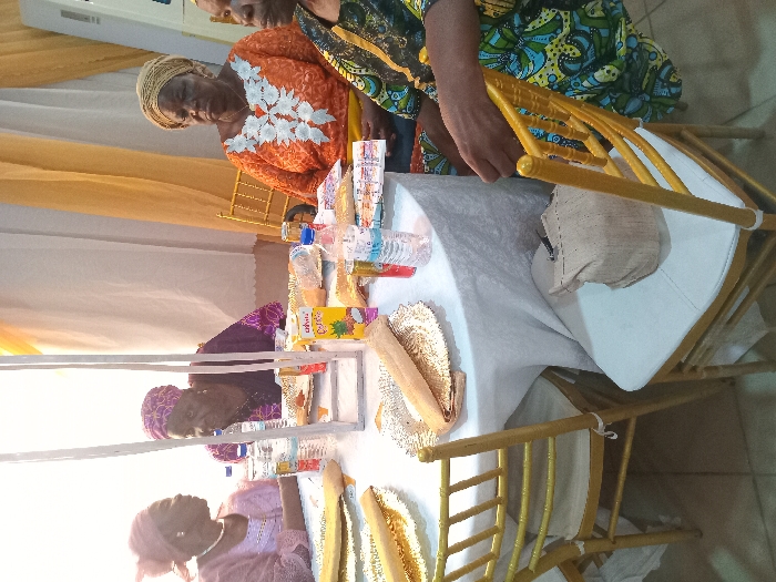 group of four older women seated at a table in an event hall in Kaduna Junction, Nigeria, located at coordinates 10.481, 7.428. The women are dressed in traditional Nigerian attire and are interacting with each other. The table is covered in a white tablecloth and set with plates, cutlery, and bottles of water. There are several empty chairs surrounding the table, and the walls are decorated with gold-colored fabric. The event hall is brightly lit, and the overall atmosphere is festive. One of the women is holding a small container with fruit and another woman has a small bag on the chair next to her. The event hall appears to be a large, well-decorated room with many gold details. It appears to be a celebration.
