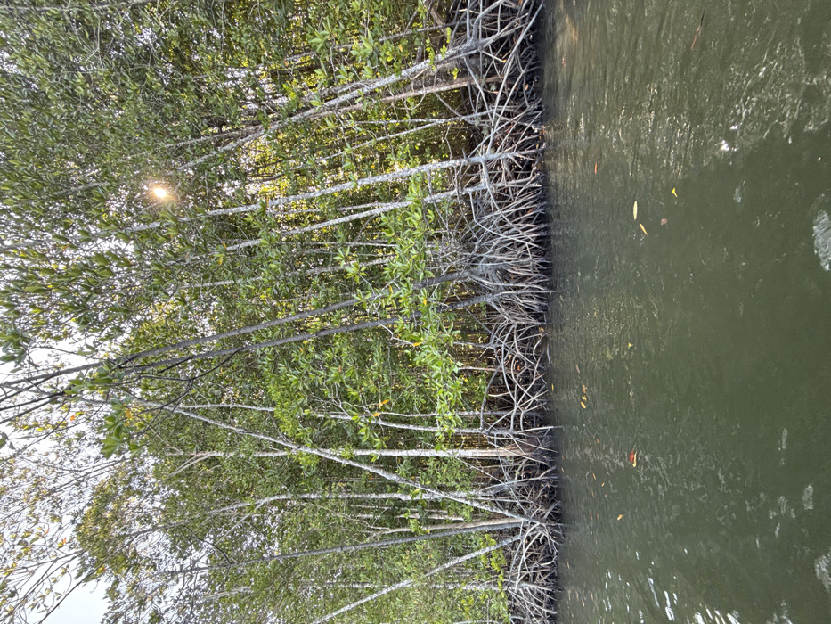 A view of a mangrove forest, showing trees with numerous aerial roots