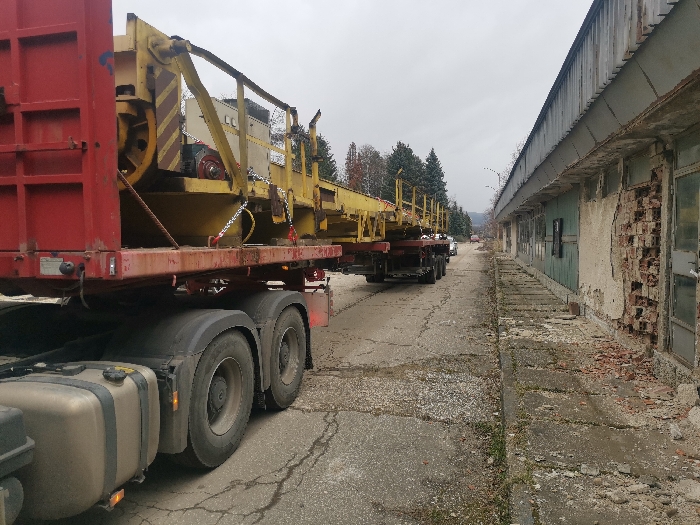 The scene depicts an outdoor environment in Zhivkovo, Bulgaria, on an overcast day. In the foreground, the rear section of a light-colored semi-truck cab and a red flatbed trailer are visible on a cracked asphalt road. The trailer is laden with a large, yellow, multi-sectioned piece of industrial equipment, possibly part of a conveyor system, secured with chains and ropes. Visible components include a large yellow wheel or pulley with diagonal black and yellow stripes, and various metal supports. Extending into the mid-ground, a second identical semi-truck and trailer combination, also carrying similar yellow equipment, is positioned directly behind the first. Further down the road, additional vehicles are faintly discernible. To the right, a long, single-story building runs parallel to the road. This structure exhibits significant disrepair, with large sections of its light-colored facade having fallen away, exposing red brickwork beneath. Areas of peeling light-green paint are also present. Windows and doors appear broken or damaged, with some glass missing. A deteriorated, raised concrete sidewalk, littered with debris and broken bricks, separates the road from the building. Overhead, the building features a worn, corrugated roof overhang. The background features a line of trees, including conifers, against a backdrop of distant hills under a gray sky. No individuals are visible.