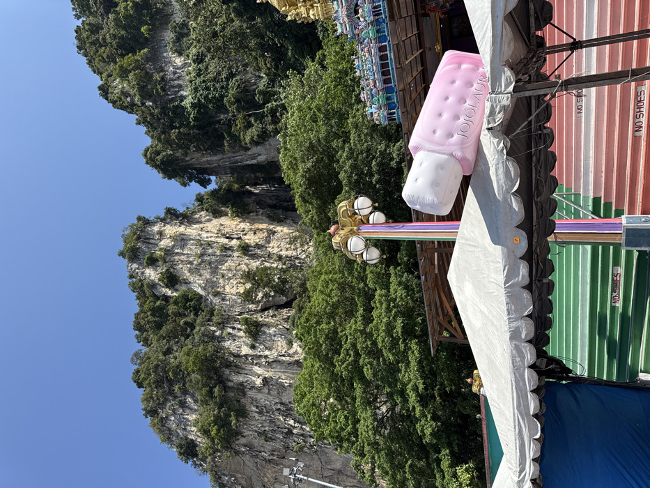 A rocky cliff with lush greenery stands tall under a clear blue sky. A pink inflatable "JOJOLAUR" cookie floats near a staircase structure. A lamp post with ornate white globes is visible. A white tent and multicolored railings are also in the frame. Signs reading "NO SHOES" are displayed on the building. The overall scene is a mix of natural beauty and man-made structures.