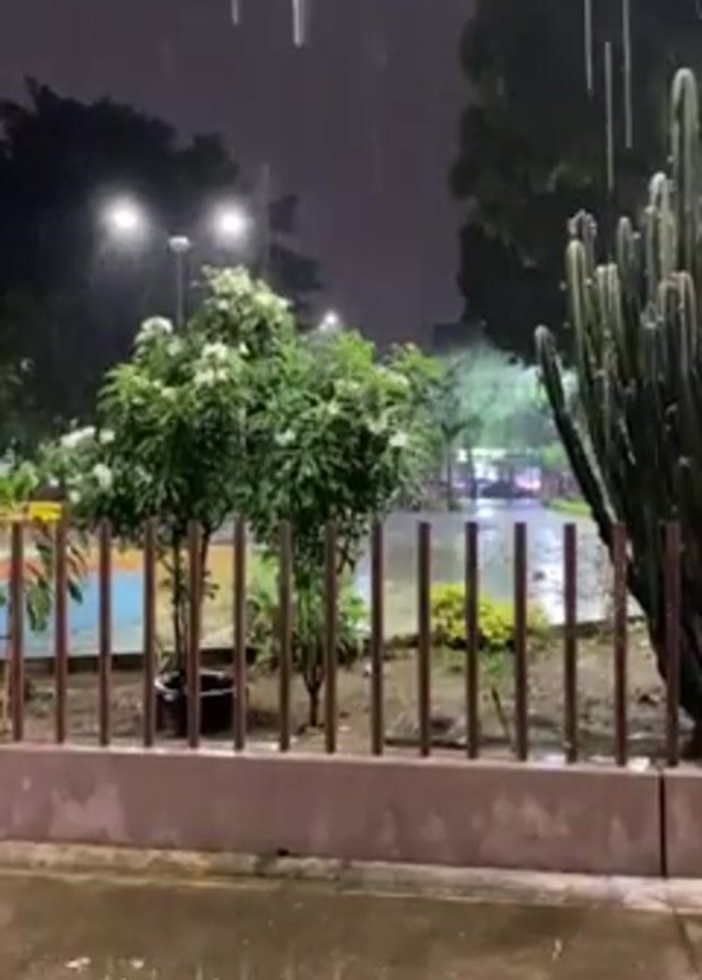 The video depicts a heavy rainstorm at night