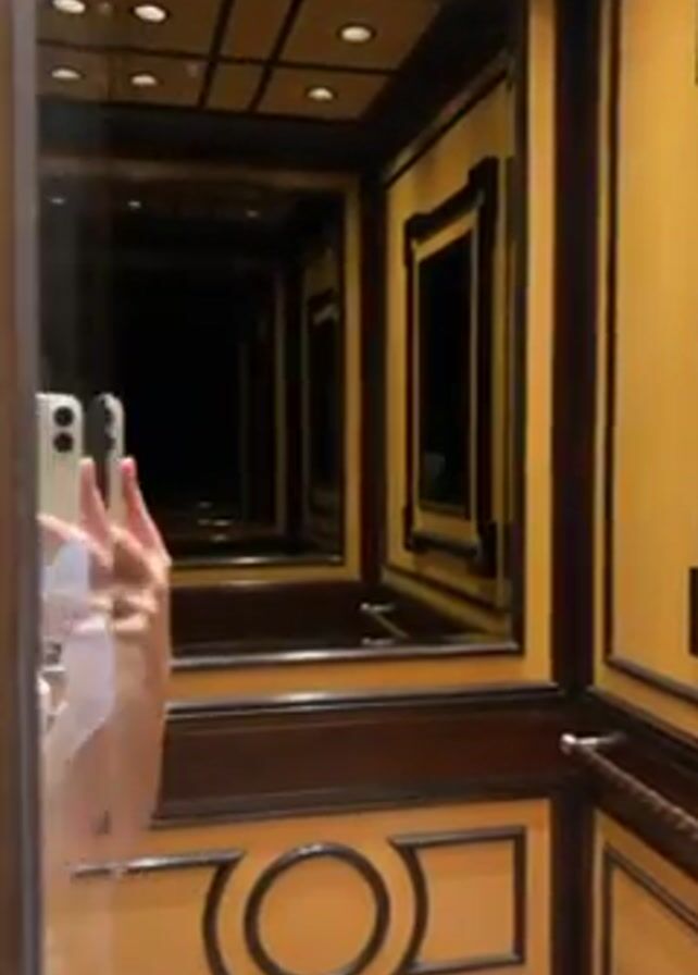 interior of an elevator. The walls are paneled with yellow and dark brown wood, featuring decorative circular and rectangular designs. A large mirror on one wall creates an infinity effect, reflecting the opposite wall multiple times. The ceiling has recessed lighting. A person's arm holding a smartphone appears in the mirror, presumably taking a selfie or recording the scene. The elevator floor is tiled in a light color with green accents.