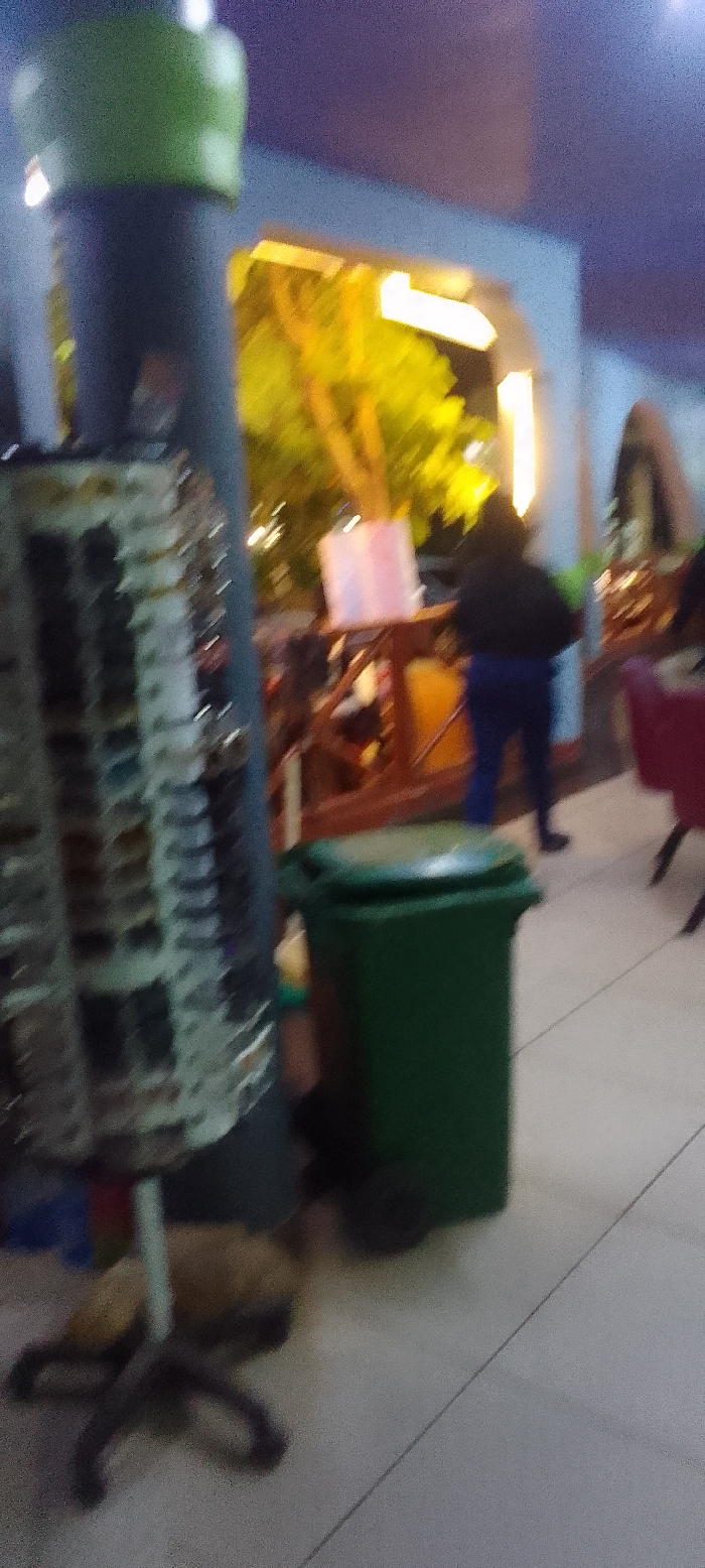 view of a shop in Mtito Andei, Kenya, located at coordinates -2.694, 38.168. The shop is dimly lit and has a blue, green, and white color scheme. In the foreground, there is a large, circular display stand with rows of sunglasses. There is a green trashcan near the display stand. A person, possibly a shopkeeper, is standing near a wooden railing behind the display stand. The railing appears to separate the shop from the exterior, where a green tree is visible. The shop has a light, tiled floor and a ceiling with muted lighting. The image is blurred, making it difficult to make out more detail.