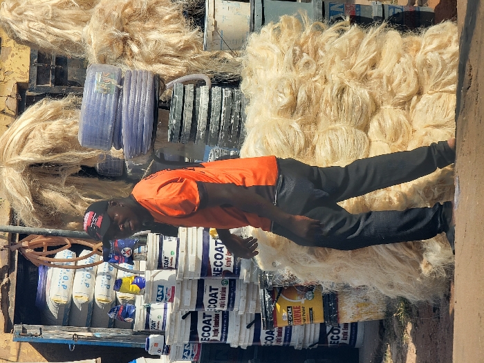 A dark-skinned male, wearing an orange t-shirt with black trim, dark pants, and a black baseball cap with a red emblem, stands partially facing the camera in an outdoor setting in Maiburiji, Nigeria. He is positioned between two distinct merchandise displays. To his left, stacked white plastic buckets labeled "NECOAT Acrylic Emulsion" are visible, alongside smaller yellow and blue containers. Behind these, within an open truck bed or stall, multiple white sacks, likely containing cement or similar building materials, are stacked. An orange coiled hose hangs from the structure. To the man's right, large quantities of light-beige, bundled fibrous material, resembling sisal, are prominently stacked. Above this, several coils of translucent purple/blue hose are stacked, along with a stack of dark, flat, circular objects. The ground is uneven dirt or concrete, and the scene is brightly lit by natural sunlight.