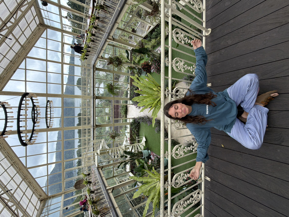 A woman with long brown hair lies in a relaxed pose on a dark wooden deck, leaning against an ornate white railing. She wears a blue long-sleeved shirt and light blue pants with brown sandals. Behind her, a grand glass structure houses lush greenery, hinting at a botanical garden or conservatory. Beyond the glass, a mountainous landscape is visible under a cloudy sky, providing a scenic backdrop.
