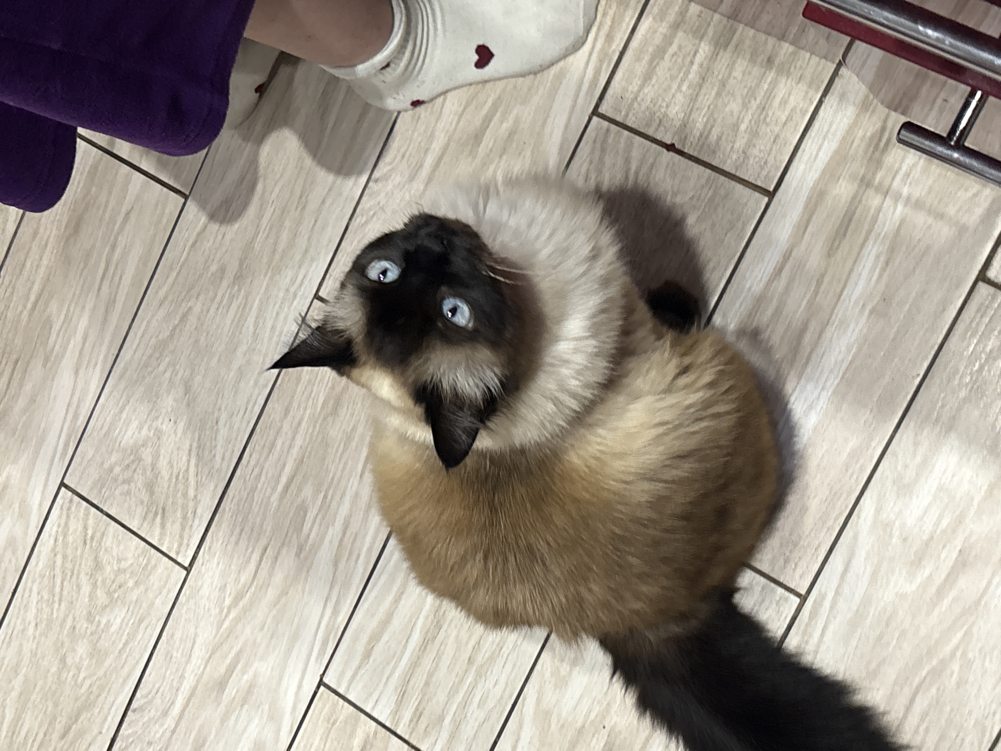 A Siamese cat with striking blue eyes sits on a wood-patterned floor, looking up. To the left, a person's leg is visible, wearing a purple garment and a white sock with a heart. Part of a metal chair leg is visible to the upper right. The location is not discernible as being in Simferopol, Ukraine from the image alone.