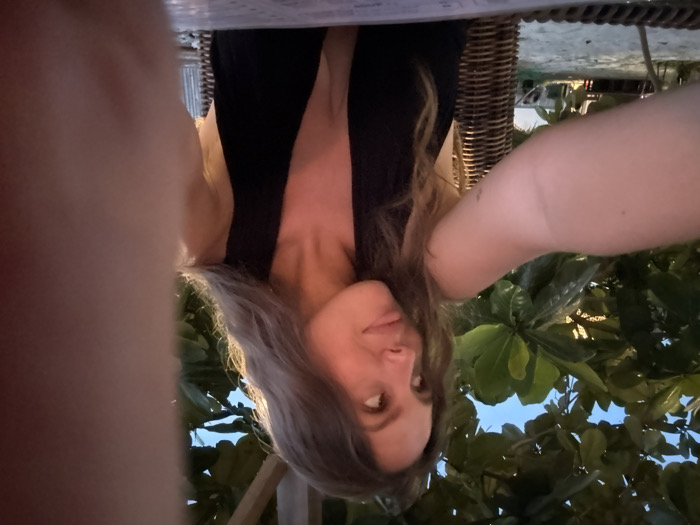 A female subject is depicted in a close-up selfie taken outdoors during twilight hours in an unknown city in Indonesia. The subject, centrally framed, possesses long, wavy, light brown hair, illuminated by warm backlighting, and is wearing a black, deep-V neck sleeveless top. She is observed looking towards her right (viewer's left) with a subtle smile. Her left arm is extended into the foreground, holding the camera device. She is seated at a table, with a white document or menu visible on the surface in the lower foreground. A woven rattan chair back is partially visible to her right. The background features lush green foliage under a dark blue sky, indicating dusk. Sandy ground is discernible beneath the foliage, consistent with a beachside or coastal environment.