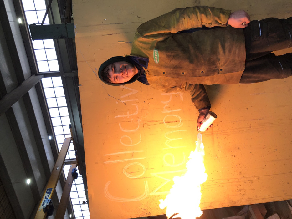 A person in a welding jacket holds a spray can, spraying fire onto a yellow surface with the words "Collective Memory" written on it