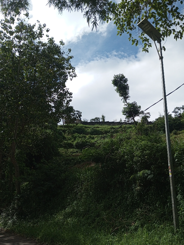 The image displays a daytime outdoor scene in Ariyalai, Sri Lanka, featuring a steeply sloped, heavily vegetated terrain under a partly cloudy sky. The upper portion reveals a bright blue sky with scattered white cumulus clouds. Dense, untamed green foliage dominates the foreground and midground, covering an ascending hillside. A large tree with dark green leaves occupies the left side of the frame, extending towards the sky. Along the top edge, leaves resembling bamboo are visible. On the far right, a tall, slender grey metal pole supports a rectangular, solar-powered street light fixture. Two dark cables or wires run horizontally across the mid-section of the image, traversing the vegetated slope. A segment of a dark-colored road or path is visible at the lower left edge. At the crest of the hill in the background, a light-colored wall or building structure is discernible, partially obscured by trees, with additional faint structures visible on the distant horizon. No individuals, animals, specific actions, or interactions are present in the frame.