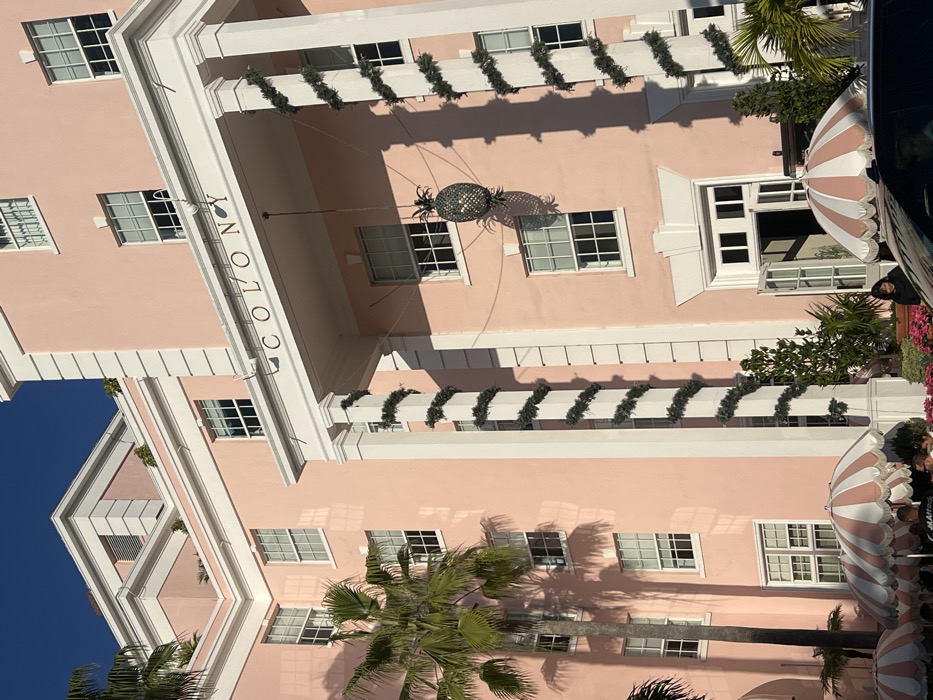 A light pink building with white columns and window frames, featuring the word "COLONY" vertically on one side. A decorative pineapple hangs under an arched entrance, casting a shadow. Palm trees are prominent in the foreground. White and pink striped awnings are visible along the building's side. Greenery adorns the building and surrounding area, set against a clear blue sky.