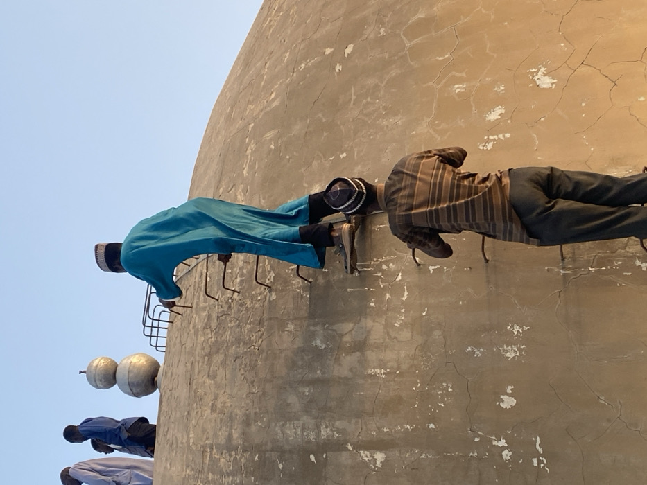 - "The scene depicts four male individuals on a weathered light-brown concrete dome structure in Barako, Nigeria, under a clear blue sky" by FM-UMff02, licensed under CC BY 4.0