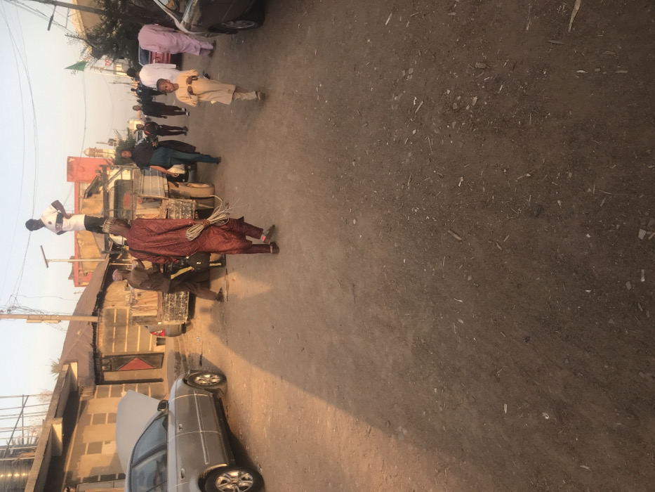 This image depicts a dusty, unpaved street in Sardauna, Nigeria, under daylight with long shadows indicating a low sun angle