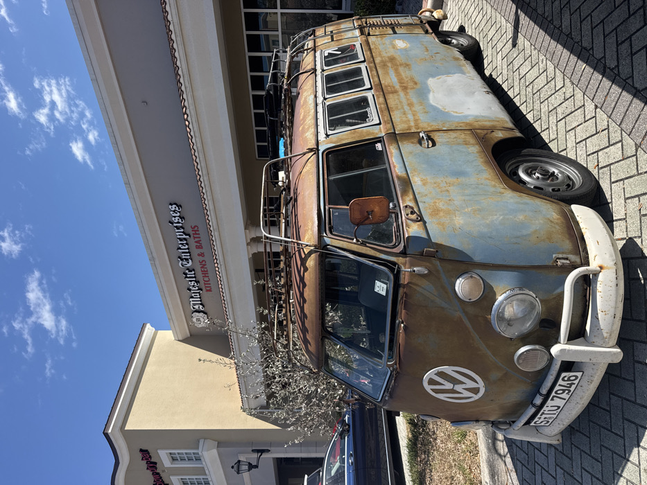 - "A heavily rusted, vintage Volkswagen Type 2 van is parked on a herringbone brick paver surface under a clear blue sky with scattered white cumulus clouds" by FM-SjRFd2, licensed under CC BY 4.0