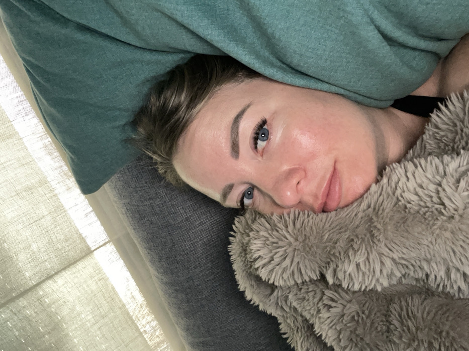 An adult female is depicted in a supine or reclined position indoors, likely within a residence in València, Spain. She has fair skin, blue eyes, and light brown hair; her eyelashes appear enhanced. Her facial skin exhibits a sheen, particularly on her cheeks and nose. Her head rests on a teal-colored pillow visible to the right of the frame, and a textured grey fabric surface, consistent with upholstery, forms the background behind her head and upper body. A fluffy, light brown/grey blanket with a shaggy texture covers her lower face and chest area. She is looking directly into the camera lens. Ambient light enters from an upper window, partially obscured by a light-colored, textured roller blind or fabric shade, visible in the upper left background.