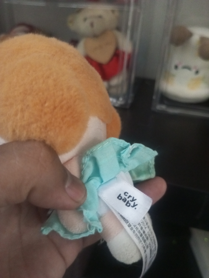 A hand holds a "cry baby