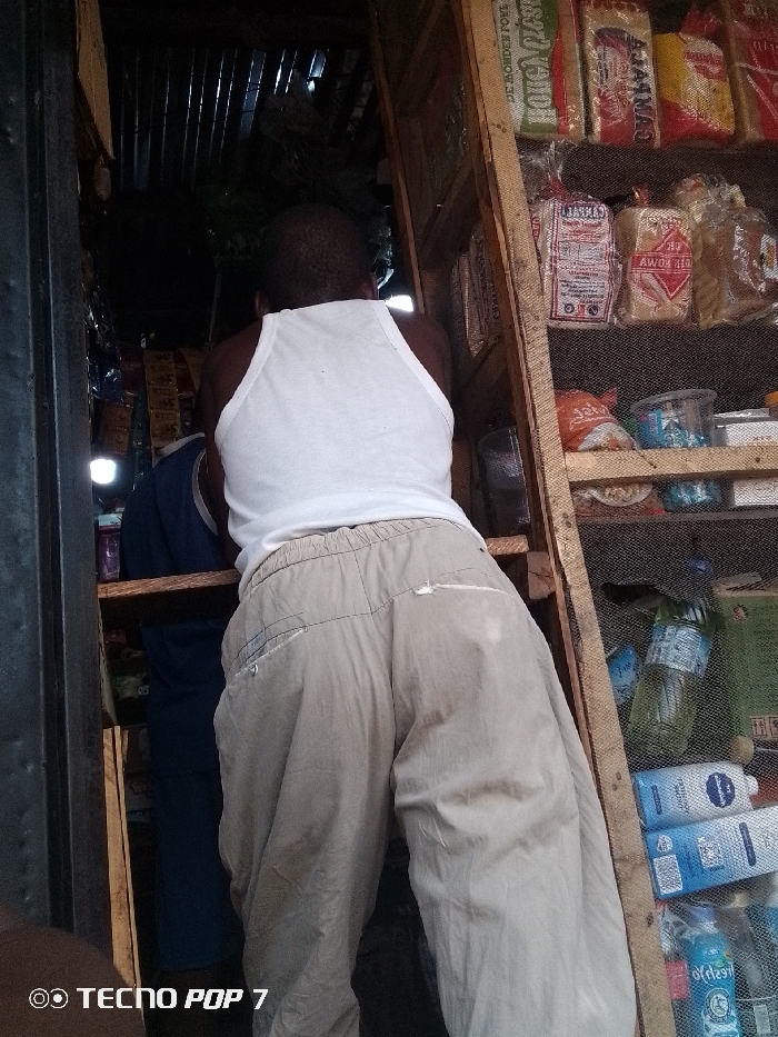 The image depicts the interior of a small shop or market stall in the city of Unknown, Unknown. A person, viewed from behind, is the primary subject, standing centrally within the frame. This individual has short dark hair, wears a white sleeveless undershirt, and light brown or khaki elastic-waisted pants with visible creasing and minor wear. To the left and slightly behind, a second person is partially visible, wearing a dark blue garment. On the right side of the image, a multi-tiered wooden shelving unit is filled with various merchandise. The shelves are constructed from wooden slats, with some sections having a mesh or net barrier. Items on display include numerous packages of bread or similar baked goods in clear plastic, other packaged food items with colorful labels (e.g., "AWUMU," "CANAAFA"), and small plastic containers. Lower shelves hold bottled beverages, including clear liquid in a green bottle, cartons, and plastic bottles with blue labels (one resembling a Nivea product, others possibly soft drinks like Fanta). The shop's ceiling, visible at the top, appears to be made of corrugated metal. A dark vertical structure, likely a door frame or support, occupies the far left of the frame. Lighting suggests a mixture of natural light from an unseen opening and a small artificial light source in the background.
