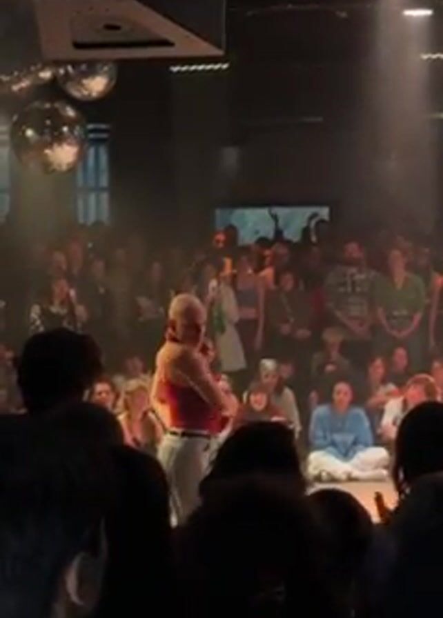 A recording shows a performance taking place in a large, dark room with a crowd of people. A person with a shaved head, wearing a red top and light-colored pants, dances in the center of the room. The audience sits on the floor around the dancer. Above, disco balls hang from the ceiling, and a spotlight illuminates the dancer. Some audience members are filming the performance.