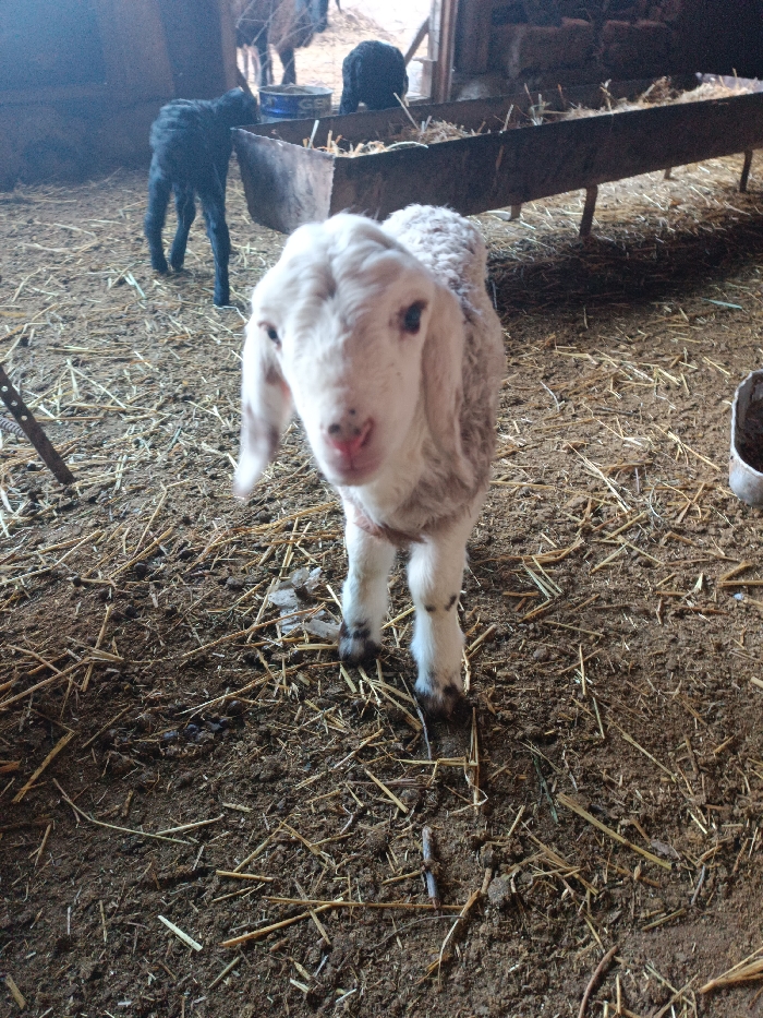 The image displays an indoor animal pen or barn located in the city of Unknown, Unknown. A young lamb, predominantly white with faint brown patches on its face and lower legs, stands in the foreground, facing directly towards the camera. Its snout is pink, and its eyes are dark. The floor is covered with packed dirt and scattered dry straw or hay. In the mid-ground, to the left, a smaller, dark-colored lamb or kid stands facing away from the viewer. A long, trough-like feeder, constructed from wood or metal and containing hay or straw, spans the mid-ground towards the right. Multiple additional dark-colored sheep or goats are partially visible in the background, some near the feeder and others further back near an apparent doorway or opening that reveals a brighter area beyond the structure on the far right. No human subjects are present. The scene is illuminated by ambient light entering the enclosure.