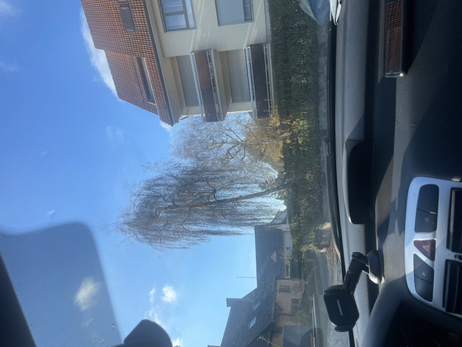 The scene is captured from inside a vehicle, looking forward through its windshield, depicting a residential street in Reichstett, France. The vehicle's dark gray dashboard occupies the lower frame, featuring a black Grundig brand phone holder suction-mounted to the left of center, and a portion of the car's control panel with an illuminated red hazard warning triangle button. The exterior displays a clear blue sky with scattered white clouds, under bright daylight conditions. In the midground, a tall, slender weeping deciduous tree with bare, downward-hanging branches stands centrally, exhibiting a slight lean to the left. Another bare deciduous tree is positioned behind it. A dense, dark green hedge extends horizontally across the midground. To the left of the scene, a residential building with a dark tiled roof and light-colored walls is partially visible, and a red fire hydrant is located behind the hedge. To the right, a multi-story residential building features a prominent red-tiled mansard roof and a light cream-colored facade. This building includes at least two balconies with metal railings, and all visible windows are fitted with closed, light-colored roller shutters. No human individuals or active vehicles are present in the exterior environment.