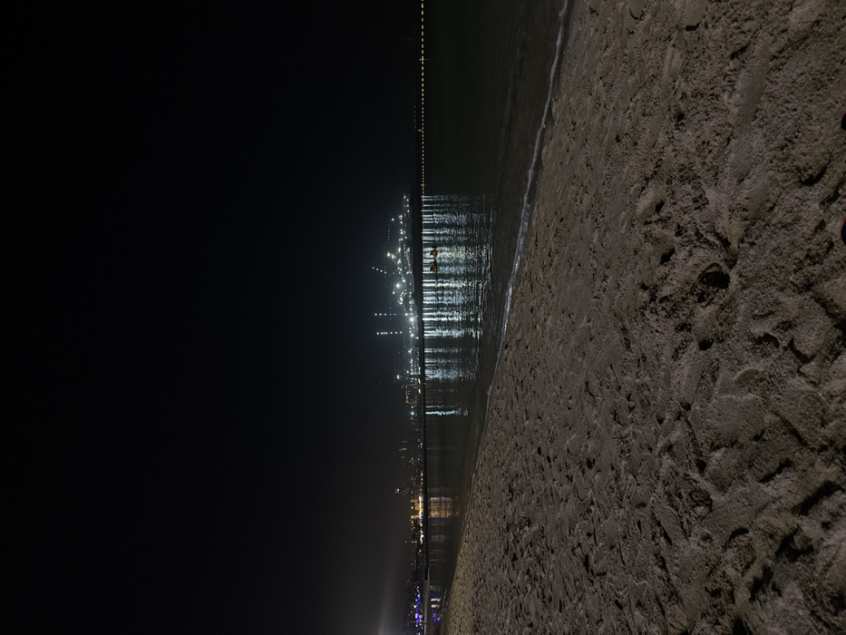 A nighttime beach scene shows a dark expanse of sand on the right, with visible textures and footprints