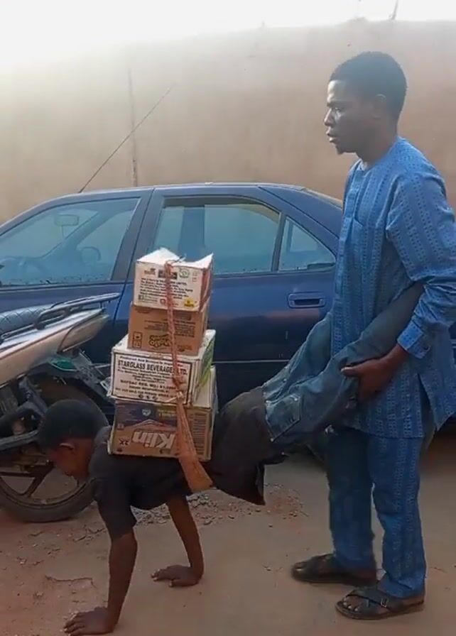 In an outdoor scene, a person wearing a black t-shirt is on their hands and knees, acting as a human “pack animal”, with a stack of cardboard boxes strapped to their back with rope and a broom. Behind the person, is a man wearing a blue, patterned outfit, carrying another person's legs, mimicking someone being carried. In the background, a dark blue car, a parked motorcycle, and a section of a beige building wall are visible. The ground appears to be dirt and sand. The lighting is bright, likely daylight.