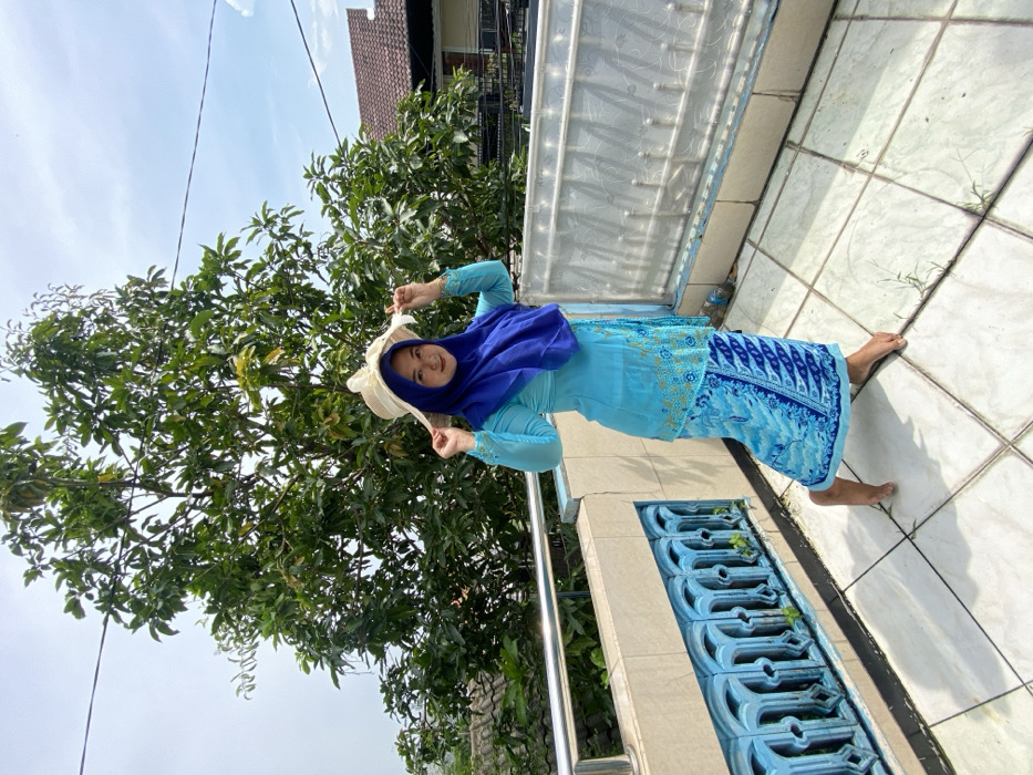 - "A woman wearing a light blue dress, dark blue headscarf, and a straw hat stands on a tiled balcony" by FM-htxI33, licensed under CC BY 4.0