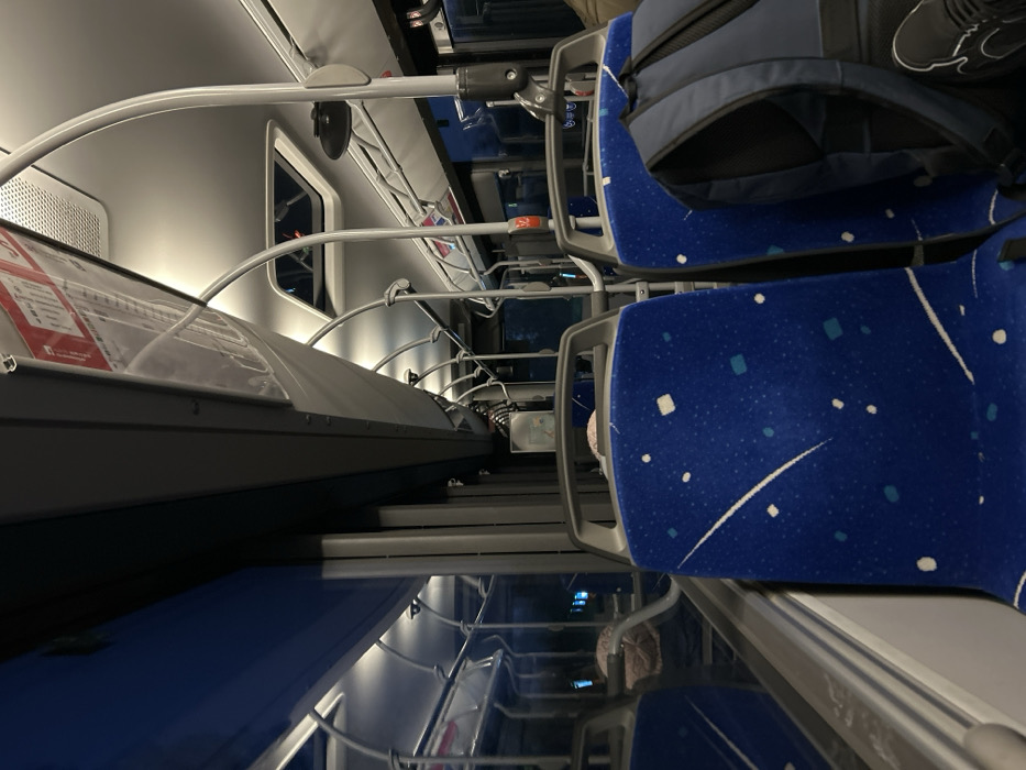 An interior shot of a bus or train with rows of blue patterned seats. A backpack is resting on the seat in the foreground. The aisle between the seats stretches into the distance. Windows and overhead compartments are visible on the left side, reflecting off of the blue flooring. The image appears to be rotated or taken at an unconventional angle, making the perspective somewhat distorted.