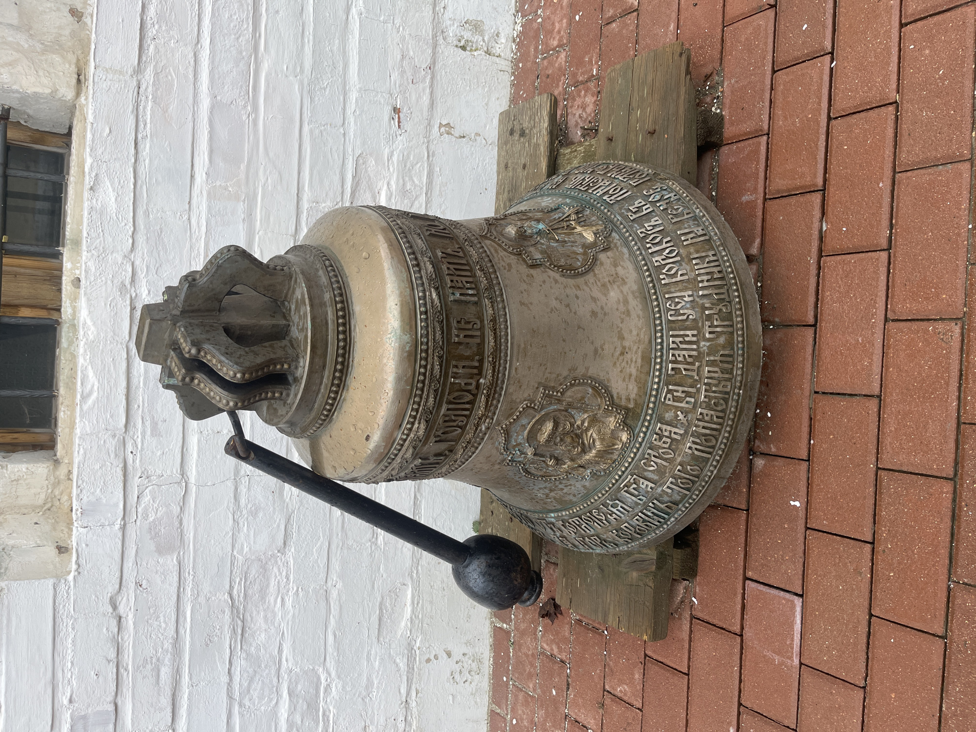 large, ornate bell mounted on wooden supports, positioned against a brick walkway and a white brick wall. The bell is made of metal and features decorative relief work, including script and religious iconography. A black metal clapper extends from the bell. The scene is illuminated by overcast natural light. The location is Луговой, Russia.