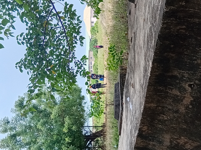 The image depicts an outdoor, daytime scene in the city of Unknown, Unknown, observed from a low vantage point. In the immediate foreground, a weathered, dark grey concrete structure, possibly a low wall or foundation, extends across the lower frame, its flat top surface exhibiting minor debris including white plastic remnants. A smaller, elevated concrete slab or planter containing nascent green foliage is present on this structure's left side. The midground features an uncultivated field of tall, dry grass and weeds. Within this field, three individuals are visible. Two individuals stand grouped towards the left: one wears a dark top and orange headwear, while the other wears dark clothing and appears to carry a blue item. A third individual, dressed in a pink top and dark bottoms, stands further right and deeper within the field, facing away. A dark fence line is partially discernible behind the left group, adjacent to a large, mature tree with dense green foliage. The background reveals several light-colored buildings with various roof designs, indicative of an urban or institutional environment. The sky is uniformly light and overcast. Overhead, branches with green leaves partially obscure the upper right portion of the frame.